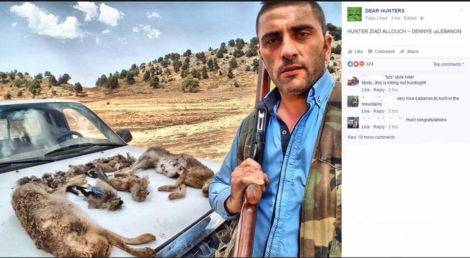 Ziad Alloush - Qarsita/Dinniyeh, 31/08/2016 killed wild animals (golden jackal), birds of prey, and other birds in violation of the law and boasted about it.