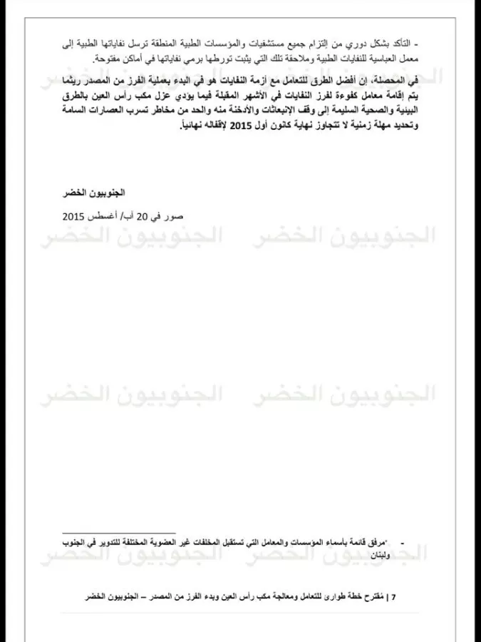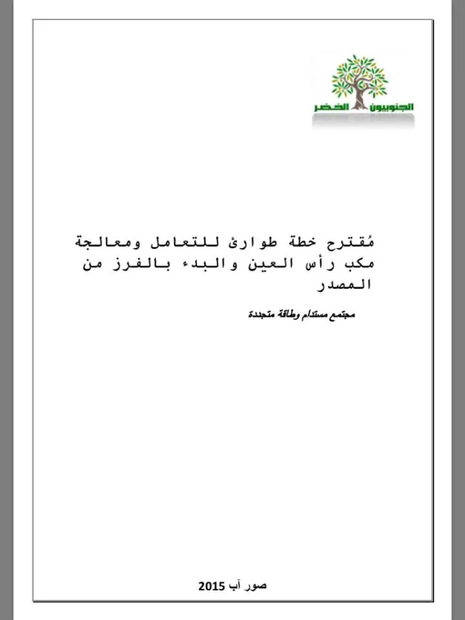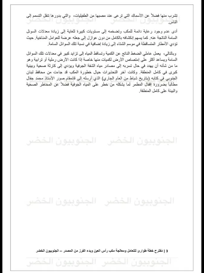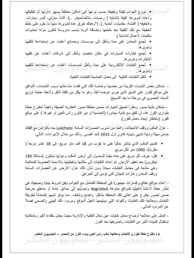 Below is the emergency plan prepared and distributed by Green Southerners on 10/09/2015, following an inspection visit to the landfill and an open public seminar about it and the ways to address it. This plan is a continuation and a more detailed and technical version of the initial plan distributed by Green Southerners on 09/08/2015 during the broad civil protest meeting organized by Green Southerners and the Cultural Youth Forum in Tyre. The plan includes rapid steps to isolate the landfill and reduce its risks before winter, before its full treatment, which may take several months the time required to carry out the remediation work. It also includes steps to begin waste sorting at source in Tyre and the surrounding villages.