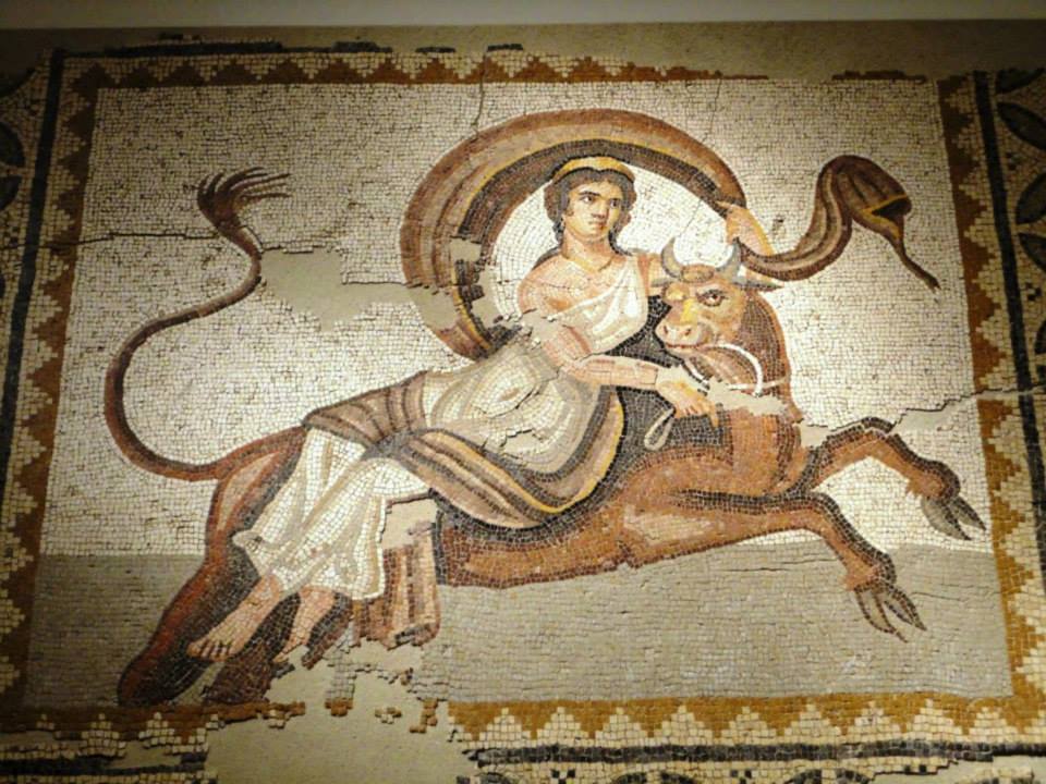 The legend says that Zeus, the god of the Greek pantheon, fell in love with the Phoenician princess Europa when he saw her once from Mount Olympus. He came to the shores of Sidon, where the princess used to stroll and always dreamed of sailing to lands where no one had reached (the eternal Phoenician dream). Disguised as a bull, he approached her and her maidens on the shore, lured her, and carried her on his back across the sea, not revealing his true identity until reaching the island of Crete.